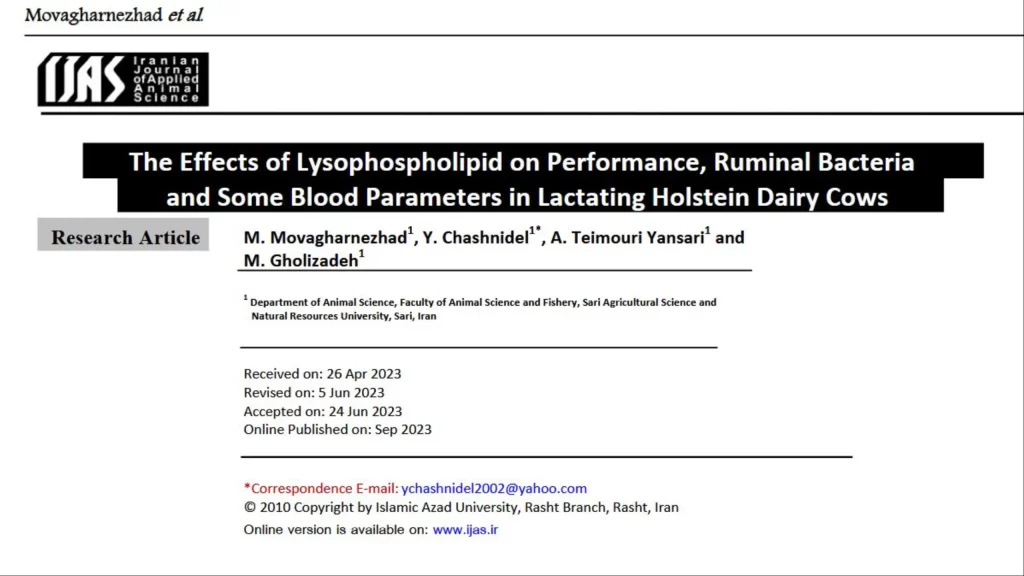 In order to examine the effects of feeding different levels of lysophospholipid (LPL) on early lactating Holstein cows, 15 cows were assigned in a completely randomized design with three experimental treatments including: 1) control ration; 2 and 3) control ration plus 0.1% and 0.15% of dry matter (DM) LPL, respectively. The experiment was conducted for 35 days (14 days for adaptation and 21 days for sample collection). Cows fed twice a day at 7:00 and 16:00 and received total mix ration (TMR). Daily feed intake and milk yield were measured. At the end of the experiment (day 35), the blood samples and rumen liquor were collected from each cow. The supplementation of LPL had no effect on DM intake and digestibility but increased digestibility of fat (P=0.0346). Addition of LPL to the diet slightly improved milk production (P=0.0673). The level of alanine aminotransferase (ALT) enzyme decreased with increasing LPL (P=0.0324) but activity of carboxymethyl cellulase enzyme activity increased (P=0.0421). Increasing LPL in the ration increased the amount of acetate (P=0.0452) and valerate (P=0.0033) produced in the rumen. The LPL significantly increased the population of cellulolytic bacteria (P=0.0386). In general, supplementing the ration of lactating cows with LPL, especially in the early lactation, increased feed efficiency in a dose-response manner, milk production and improved serum parameters, maintains liver health, improved ruminal bacterial population and fermentation parameters, and increased ruminal and hepatic enzymes activity.